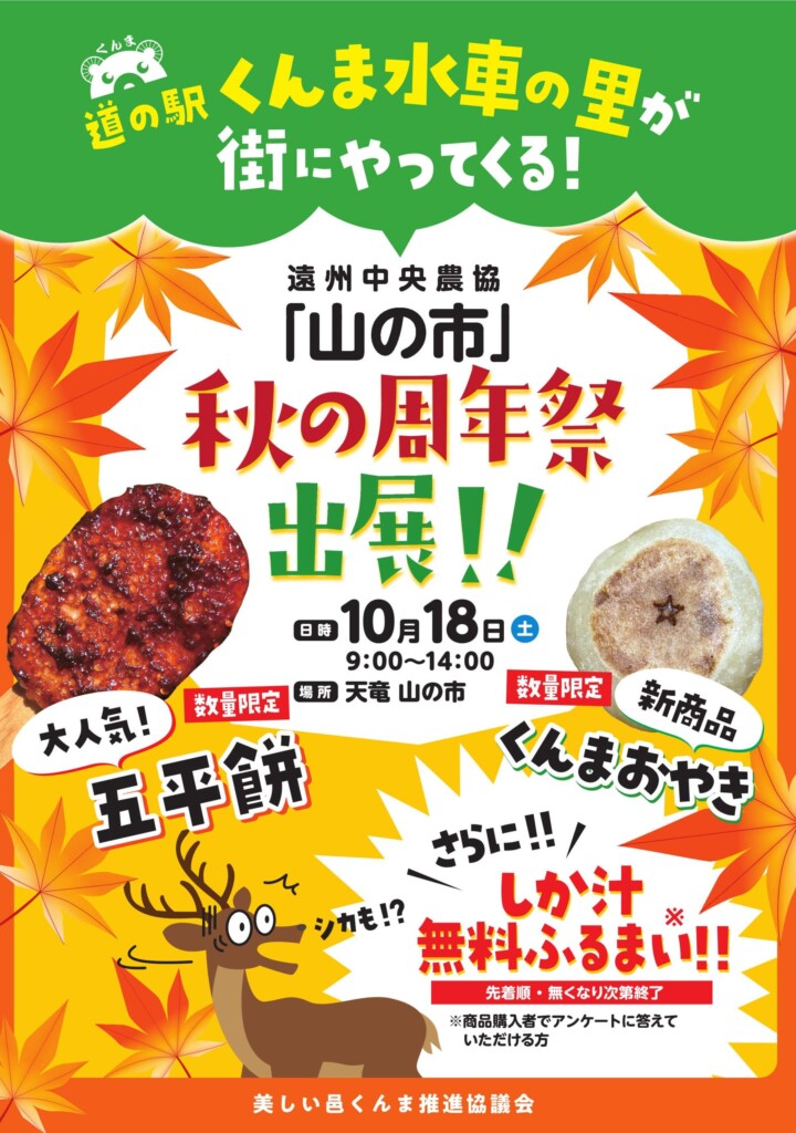 「山の市」秋の周年祭にて、くんま水車の里で大人気の五平餅やくんまおやきを販売します。さらに商品ご購入でアンケートにお答えいただいた方には、先着でしか汁を無料でふるまい!!(なくなり次第終了となります。)ぜひこの機会に天竜 山の市にお越しください!