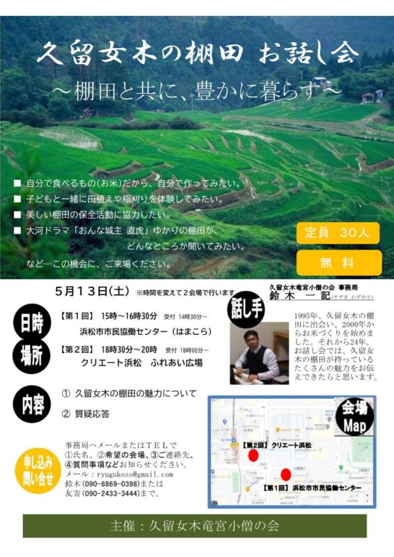 【浜松市】久留女木の棚田 お話し会(5月13日(土)開催)