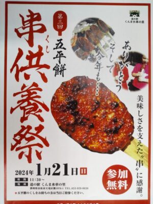 第三回目となる 「串供養祭」を開催します。くんま水車の里 自慢の五平餅を支えてくれた「串」に感謝する供養祭です。美味しさを支えた“串”を供養します。参加は無料です。当日豚汁のサービスもあります。是非お越しください!!