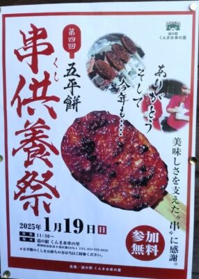「串供養祭」を開催します。くんま水車の里 自慢の五平餅を支えてくれた「串」に感謝する供養祭です。美味しさを支えた“串”に感謝し供養をします。参加は無料です。
