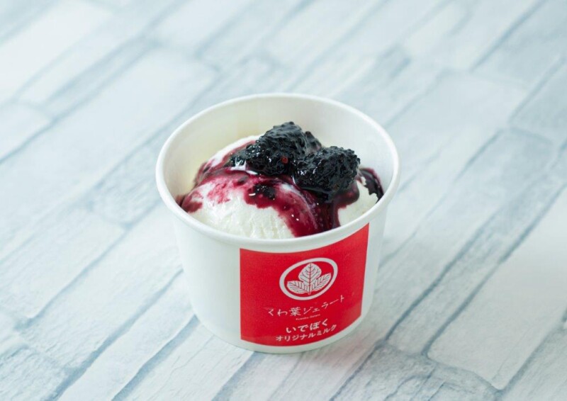 お味は、くわ葉ジェラートのほか、いでぼくオリジナルミルク味も(各税込み400円)。ミルク味用のトッピングのくわ葉パウダーや、桑の実が材料のマルベリーソースなども用意されています(各税込み50円)!