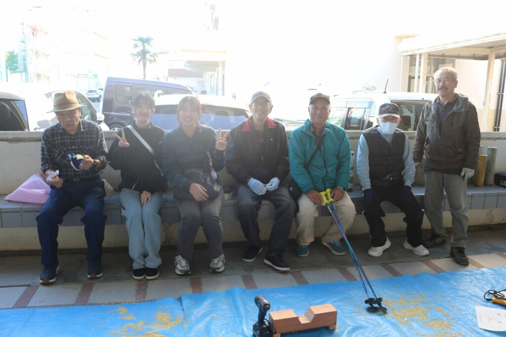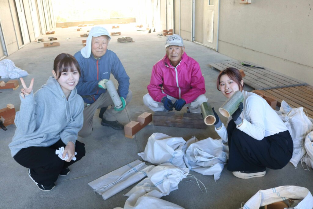 最初は⼤学⽣も地域の⽅も距離があるような印象でしたが、地域の⼈から大学生に指導のアドバイスなどがあり、だんだんと打ち解けあい最後には地域の人々と大学生と中学生と笑顔で作業を行うことができたようでした。