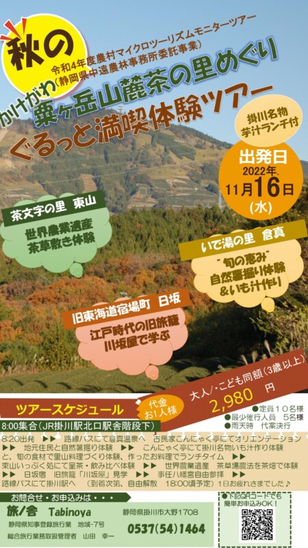 【掛川市】かけがわ粟ケ岳山麓茶の里めぐり ぐるっと満喫体験ツアー2022秋