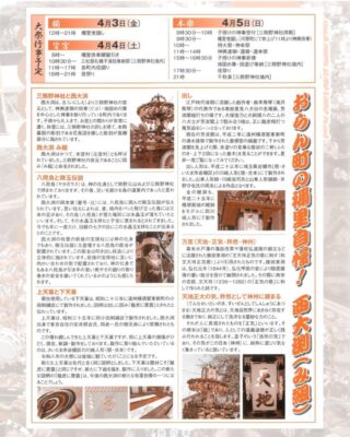 遠州横須賀の春を彩る『三熊野神社大祭』が開催されます。江戸時代から続く歴史あるお祭りで、神輿の渡御とそれに従う華やかな13台の祢里(ねり)の曳き廻しは必見です。