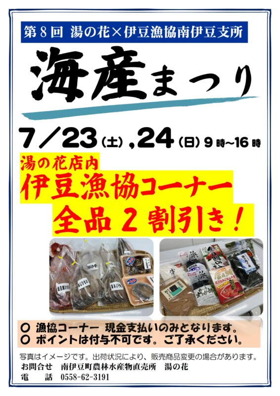 南伊豆湯の花では、7/23(土)、24(日)に「海産まつり」が開催されます。