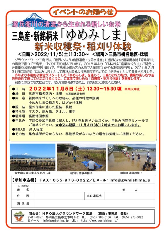 グラウンドワーク三島では、2021年3月に農林水産省より「銘柄米」に登録され、昨年より本格的な栽培がスタートした新銘柄米「ゆめみしま」の収穫祭を開催します!