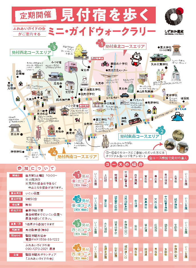 ふれあいガイドの会が案内する、見付宿を歩く ミニ・ガイドウォークラリーが定期開催しています。毎月第3土曜日に開催しています。次回は9月20日(土)東南コースです。参加費は無料です。磐田市の魅力が発見できます。ぜひご参加ください!