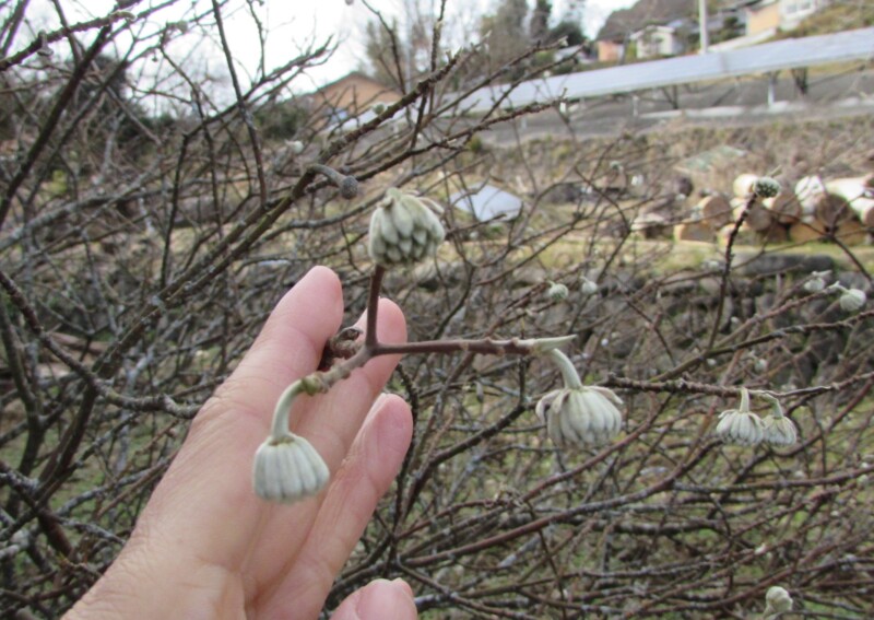 「ミツマタ」は、枝を蒸して外皮をはぎ、干したり叩いたりして修善寺紙の「繊維」になる重要な原料の一つです。