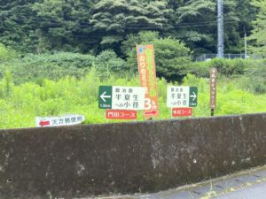 このような看板に沿って行ってください。駐車場は2ヶ所(門田・本村)にあります。