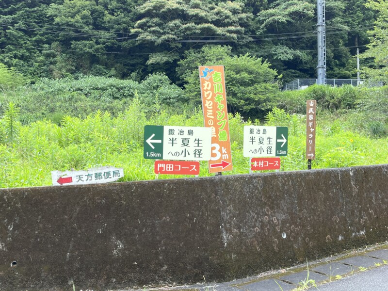 このような看板に沿って行ってください。駐車場は2ヶ所(門田・本村)にあります。