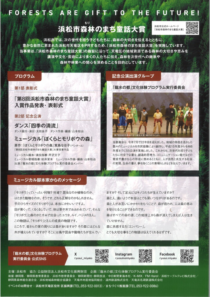 浜松市では、次の世代を担う子どもたちに、森林の大切さを伝えるとともに、豊かな自然に恵まれた浜松市天竜区をPRするため、「第8回浜松市森林(もり)のまち童話大賞」を実施しています。この入賞者への表彰を行うとともに、ダンス、大賞受賞作品をモチーフとしたミュージカル公演を開催します。森と人がお互いにかかわりをもつことで、森が救われ・人は森の恵を受けとっていることに気がつくことのできる物語です。ぜひご参加ください!