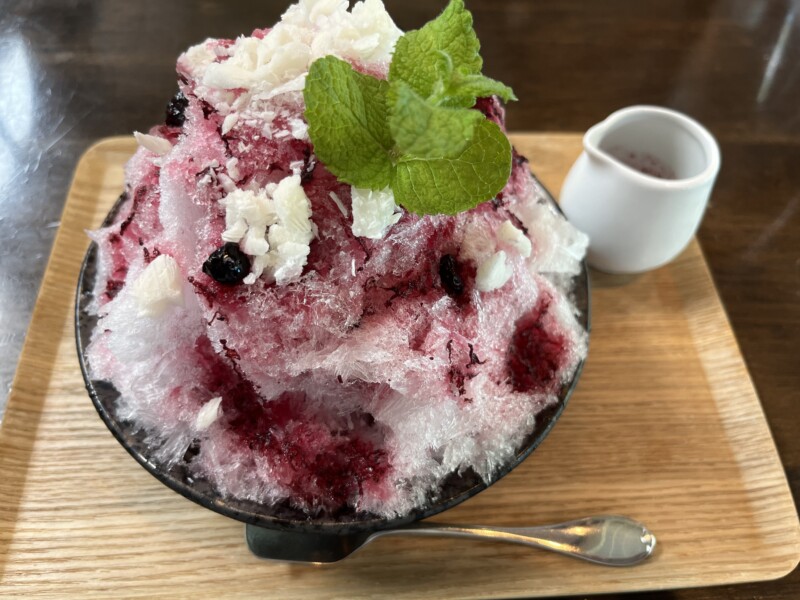 その他、アクティ森のレストランでは、鍛冶島のブルーベリーシロップたっぷりの「ブルーベリーかき氷」も7月末までの限定として販売しています。かき氷の中からは、地元の大鳥居 月花園さんの生クリーム大福入り。