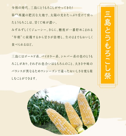 三島市の新たな農産物として産地化を目指すとうもろこし。箱根西麓の肥沃な大地で、太陽の光をたっぷり受けて育ったとうもろこしは、甘くて味が濃いですよー!