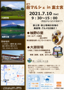 当日は、富士宮市柚野地区の「ホールアース農場」さんと、富士市大淵笹場地区の「大淵二丁目ささば景観保存会」さんが地域自慢の農産物・グルメを販売します!