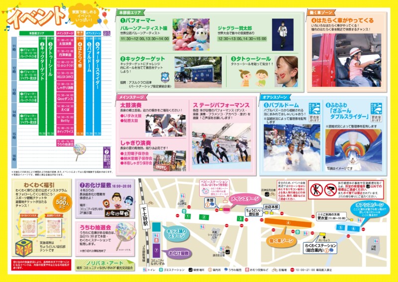 子ども向けの遊具や伝統芸能である太鼓、しゃぎりなどの演奏も楽しめます!