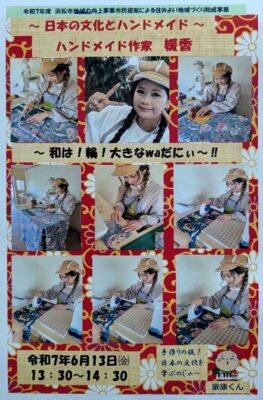 ひらがなくらぶが主催する事業の一環として、中村家住宅(浜松市中央区雄踏町宇布見)にて6/13(金)13:30-14:30 に浜松市在住のハンドメイド作家・媛香さんのハンドメイド実演会・作品展、6/20(金)13:30-14:30 に浜松市の(株)海老仙代表取締役社長・加茂氏の「浜松の魚の話」講演会を行います。