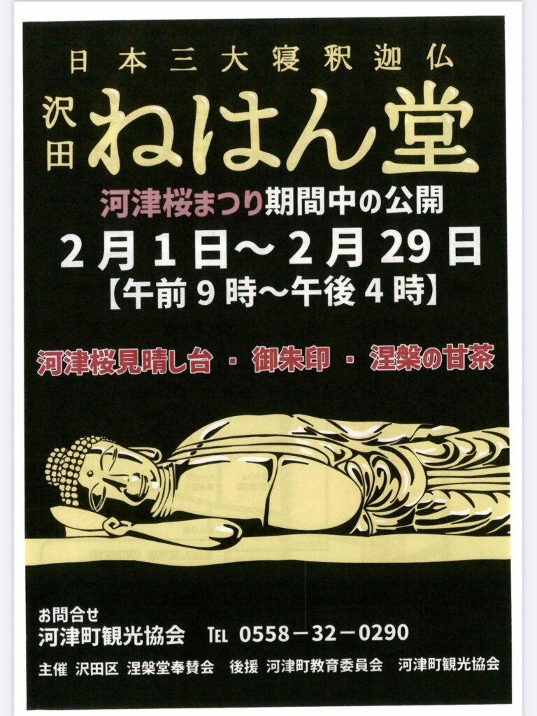 河津桜まつりで盛り上がっている河津町ですが、まつり期間中にはぜひ「沢田ねはん堂」にもお立ち寄りください。