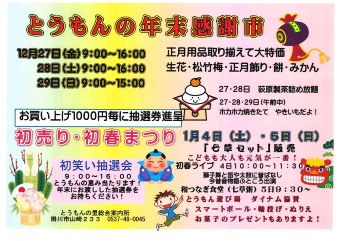 また、お買い上げ1000円毎に抽選券を進呈します。こちらの抽選券は新春まつり(1/4.5)にて「初笑い抽選会」を行います。とうもんの恵が当たります!!