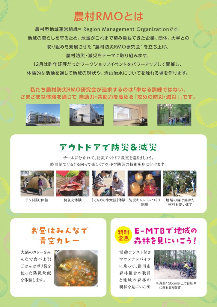 12月は昨年好評だったワークショップイベントをパワーアップして開催し、体験的な活動を通して地域の現状や、治山治水についてを触れる場を作ります。私たち農村防災RMO研究会が追求するのは「単なる訓練ではない、さまざまな体験を通じて自助力・共助力を高める「攻めの防災・減災」」です。ぜひ皆様お越しください!