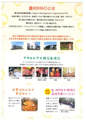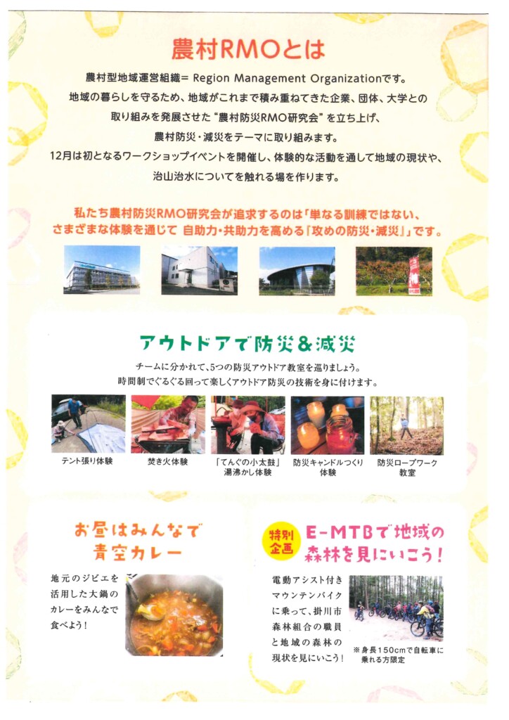 農村型地域運営組織=Region Management Organizationです。地域の暮らしを守るため、地域がこれまで積み重ねてきた企業、団体、大学との取り組みを発展させた“農村防災RMO研究会”を立ち上げ、農村防災・減災をテーマに取り組みます。12月は初となるワークショップイベントを開催し、体験的な活動を通して地域の状況や、治山治水について触れる場を作ります。