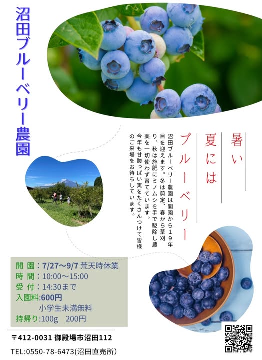 ふじのくに美しく品格のある邑“沼田ロマンチック街道”にある沼田ブルーベリー農園が開園しています。