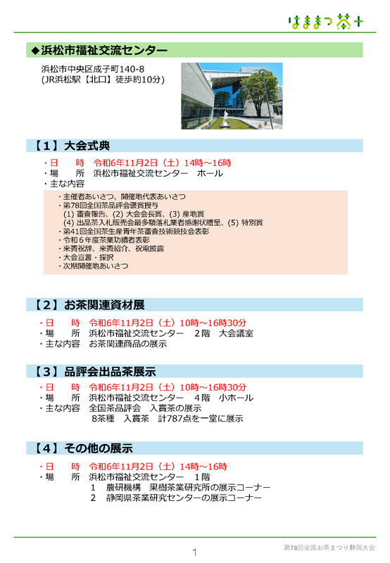 さらに、浜松市福祉交流センター(2日のみ)では、「大会式典」の他、「全国茶品評会出品茶展示」や「お茶関連資材展」を行います。