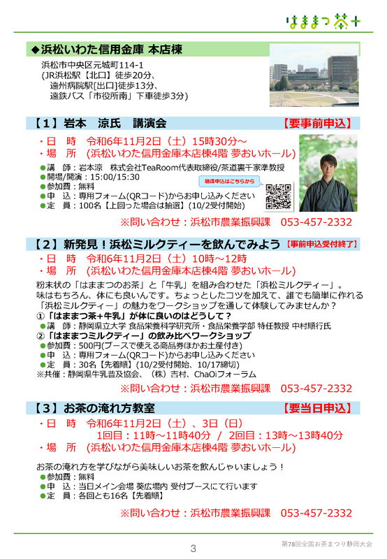 サテライト会場となる「浜松いわた信用金庫本店営業部」では、お茶の若手実業家の岩本涼氏による講演会や「はままつのお茶」と「牛乳」を組み合わせた「浜松ミルクティー」の飲み比べワークショップ、お茶の淹れ方教室などを開催します。