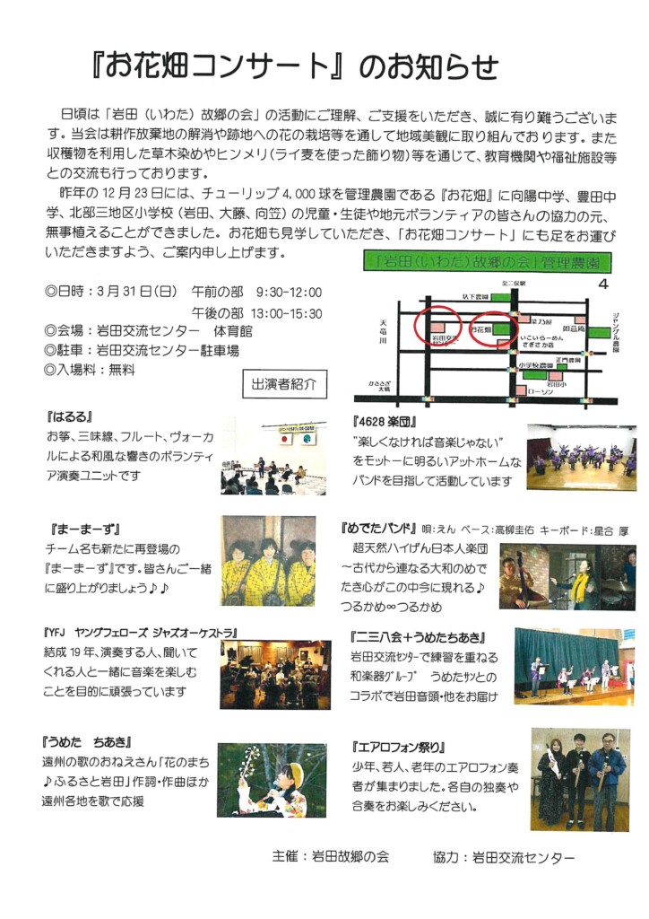 昨年の 12 月 23 日には、チューリップ 4,000 球を管理農園である『お花畑』に向陽中学、豊田中 学、北部三地区小学校(岩田、大藤、向笠)の児童・生徒や地元ボランティアの皆さんの協力の元、 無事植えることができました。お花畑も見学していただき、「お花畑コンサート」にも足をお運び下さい!
