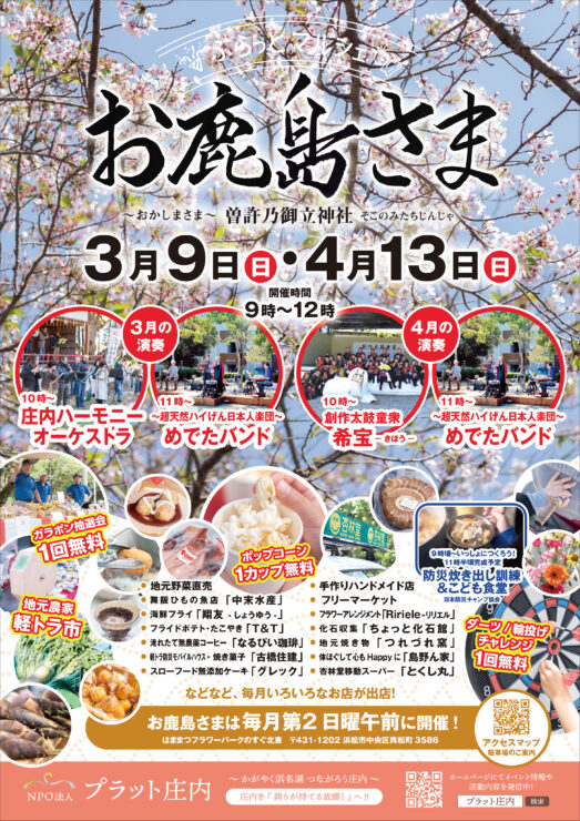 毎月第2日曜はプラット庄内マルシェ「お鹿島さま」。浜松フラワーパーク近くの曾許乃御立(そこのみたち)1神社(鹿島神社)にて、開催しています。お鹿島さまでは、お店・フリーマーケットのほか、神社の舞台での演奏もあり、毎月いろいろな方に演奏いただいています。地元の農家さんの野菜販売や、無料で楽しめるゲーム、防災炊き出し訓練&子ども食堂なども行われます。毎月色々なお店が出店します!ぜひ、一度お越しください!!