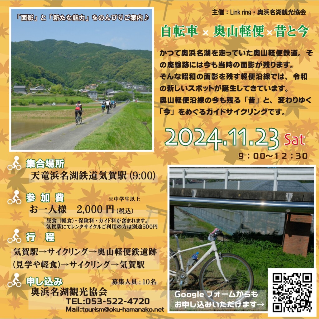 かつて奥浜名湖を走っていた奥山軽便鉄道。その廃線跡には今も面影が残ります。そんな昭和の面影を残す軽便沿線では、令和の新しいスポットが誕生してきています。奥山軽便沿線の今も残る「昔」と、変わりゆく「今」をめぐるガイドサイクリングを自転車屋さんと観光協会が、ゆるりとご案内します!