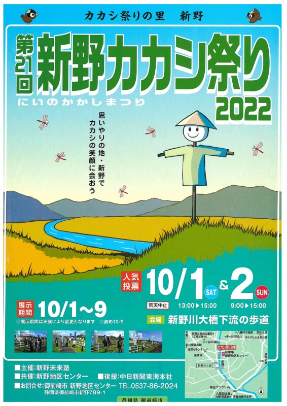 御前崎市新野地区は「カカシ祭りの里」と呼ばれ、10月1日より恒例の秋の風物詩「新野カカシ祭り2022」が始まりました。
