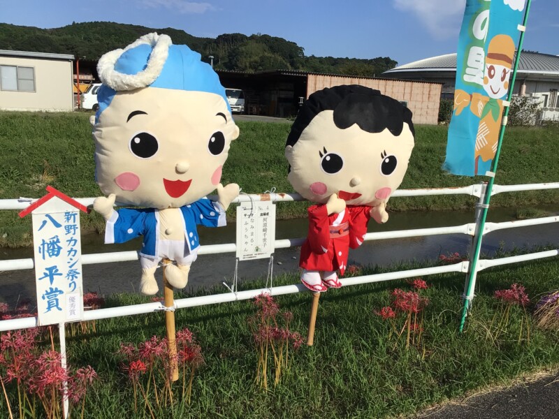 10月9日までの間、同地区を流れる新野川沿いに住民らが手作りしたカカシ23体が並び、見物に訪れた人たちを楽しませています。