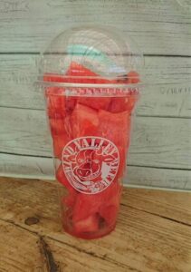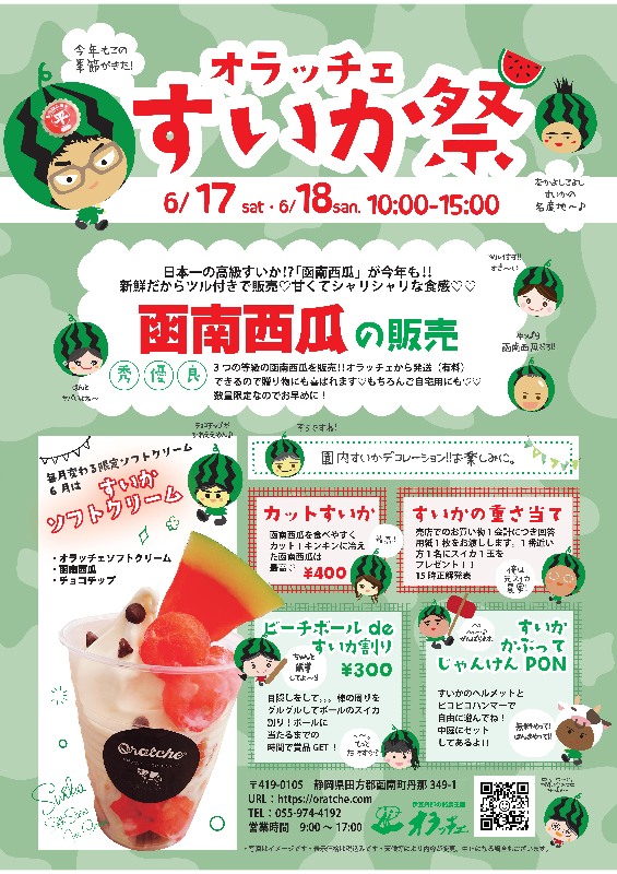 函南西瓜(かんなみすいか)の販売はもちろん、函南西瓜とオラッチェソフトクリームのすいかパフェやカットすいかも販売します!