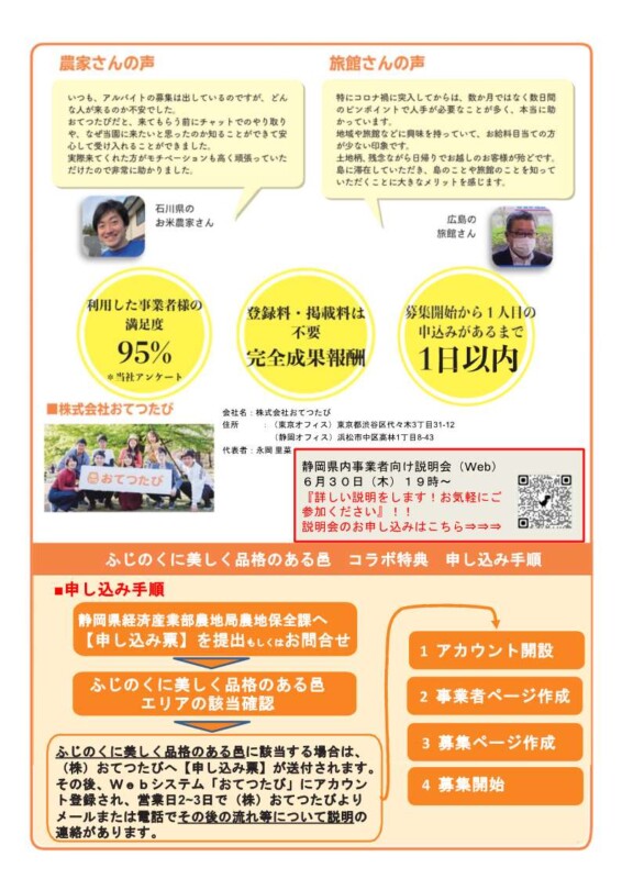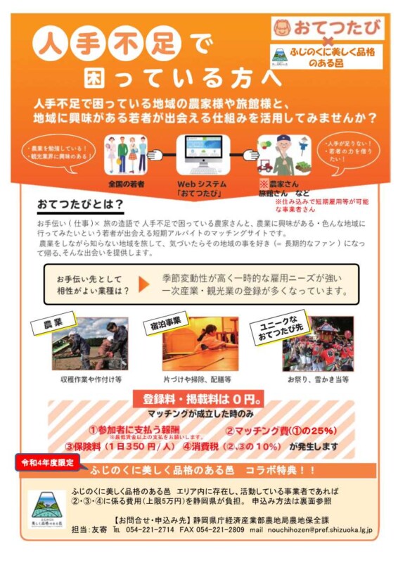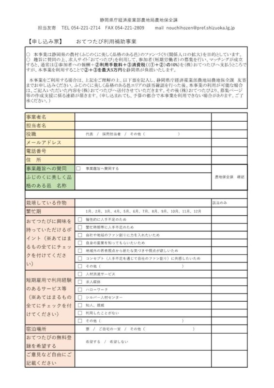 本事業をご利用する場合は、静岡県庁経済産業部農地局農地保全課 友寄までお問い合わせください。ふじのくに美しく品格のある邑エリアの該当確認を行った後、本事業の利用が可能な場合は、下記の【申し込み票】をご記入いただき、その内容を(株)おてつたびへ送付させていただきます。その後(株)おてつたびより、募集ページ等の作成支援に係る連絡が届きます。(申し込まれても、予算の都合で本事業を利用できない場合があります。ご了承ください。)