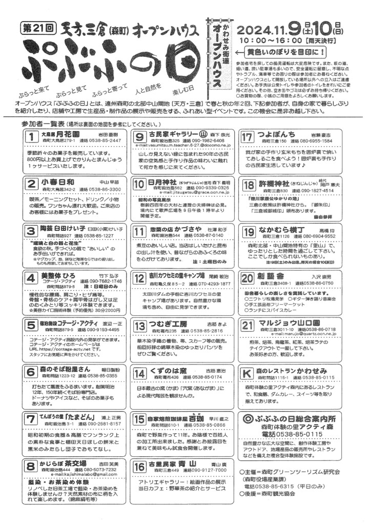 ぷぶふの日総合案内所(森町体験の里アクティ森) 電話 0538-85-0115