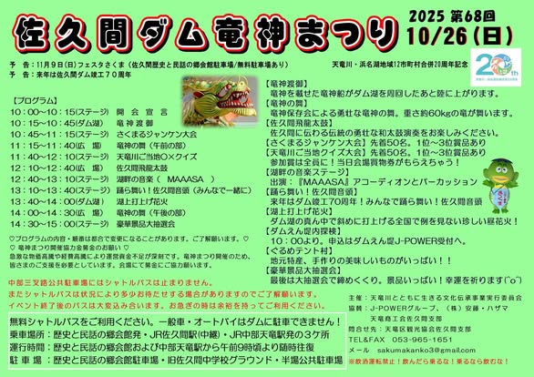 また、「佐久間ダム竜神まつりバスツアー」も募集しています。定員20名となりますので、お早めにお申し込みをお願いします。(※チラシ、HPをご確認ください。)