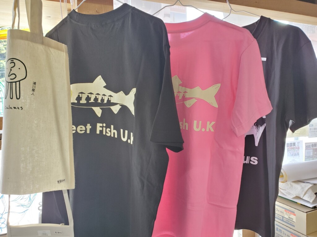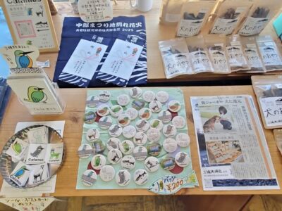 写真のようにバッグ、カップ、缶バッジ、シール、そして「三遠大猟会」の安心安全な犬のおやつ(静岡新聞にも紹介)も販売しています。