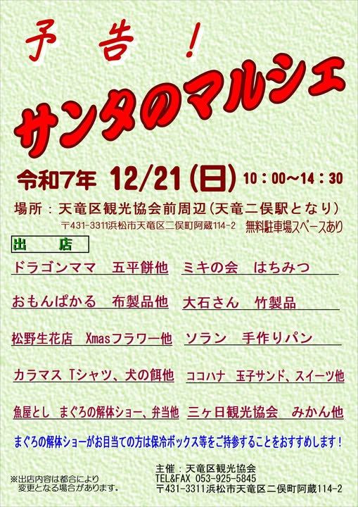 12月21日(日)は天竜二俣駅横天竜区観光協会前に集合!今年も「サンタマルシェ」を開催します。天竜区の楽しい美味しい出店が待っています!魚屋としではマグロの解体ショーもあります。是非お越しください。