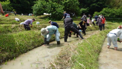 5月25日(土)、26日(日)棚田オーナーによる田植え作業を行います。各オーナーが、各々の田んぼに分かれて、田植えの作業を行います。大人から子どもまで田んぼの中で泥だらけになって楽しく田植えを行います。(写真は昨年の様子)