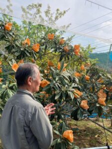 また、風が強いと、びわの実のまわりにある産毛が葉にこすられ取られてしまうので、袋がけでしっかりカバーしていきます。