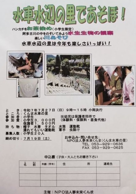 浜松市天竜区の阿多古川で水生生物の観察をしたり、ハンカチのお茶染め体験をしたり、自然の中で思いっきり夏を楽しんでみませんか?