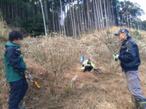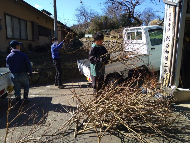 100%地元産の修善寺紙制作を目指す「修善寺紙を再現する会」と「伊豆市地域おこし協力隊」舛田隊員が、工房に隣接する地区で活動する団体「地縁団体北又区」が管理する山で、同団体が植樹していた和紙の原料である「ミツマタ」の刈り取りを行いました。