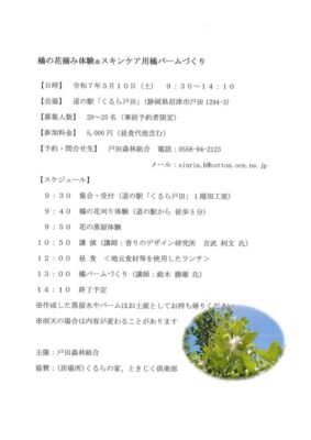 戸田(へだ)森林組合では、「橘(タチバナ)の花摘み体験&橘バームづくり」を開催いたします。