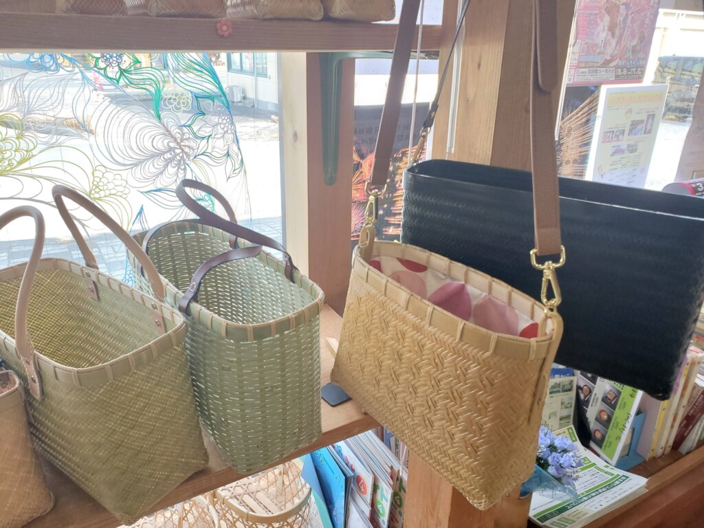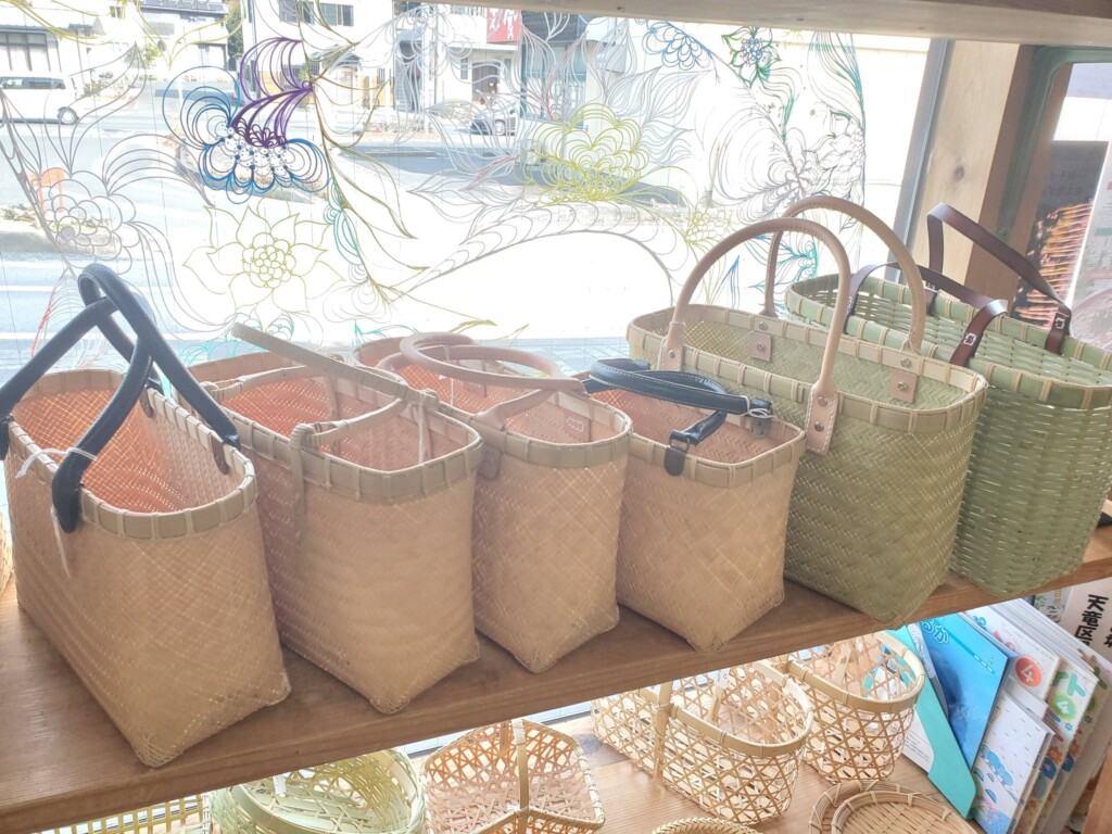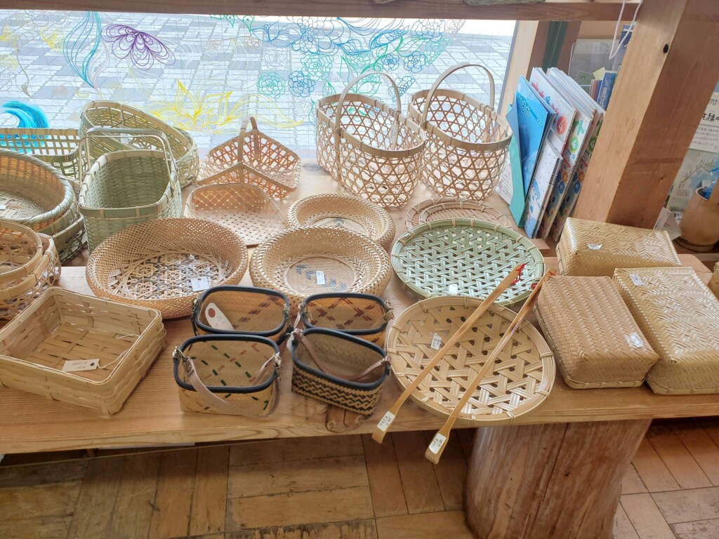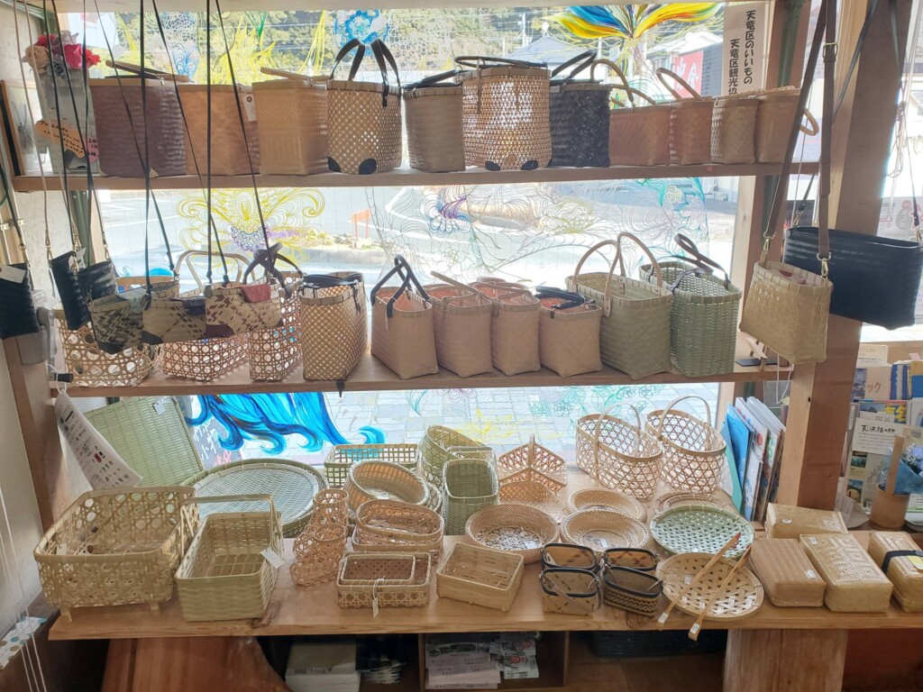 天竜区観光協会事務所内(天竜二俣駅隣接)で、今回は阿多古地区で活動する「竹の家の皆さんの作品」が展示販売中です。いずれも丁寧に作られた作品ばかりで、いつも大人気です!