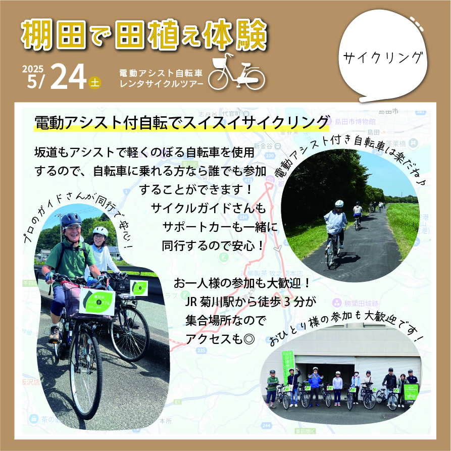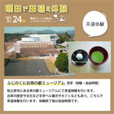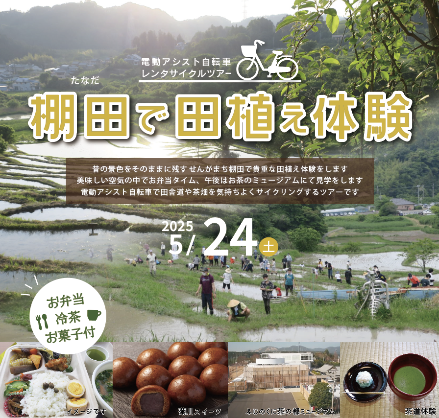 昔の景色をそのままに残す「せんがまち棚田」で貴重な田植え体験をします。美しい空気の中でお弁当タイム、午後はお茶のミユージアムにて見学をします。電動アシスト自転車で田舎道や茶畑を気持ちよくサイクリングするツアーです。ぜひご参加ください!