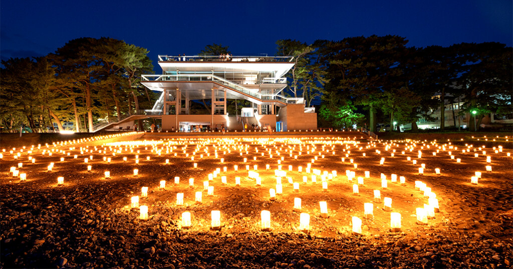 日が沈み始めたタイミングで火が灯され、砂浜は幻想的な光景に包まれます。海岸に隣接する複合施設「テラッセオレンジトイ」の津波避難タワーから見下ろせば、海岸全体を彩るキャンドルアートを一望できます。