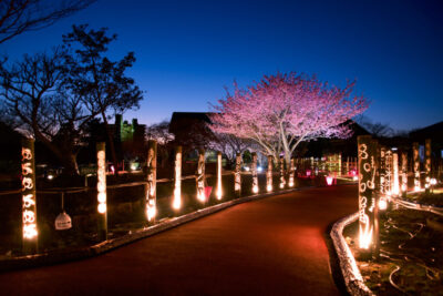 土肥金山夜桜ライトアップは、1月17日とまつり期間中の金・土・日曜日17:00〜20:30(最終入場20:00)入場無料でご覧いただけます。