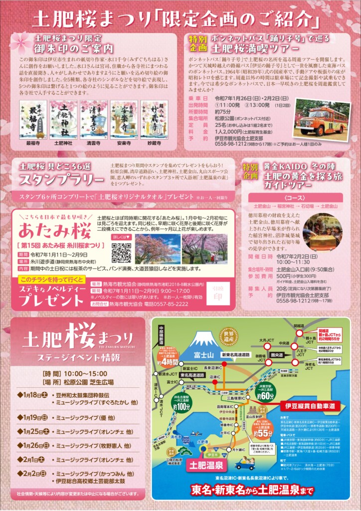 土肥桜まつりでは、土肥桜見どころ6選スタンプラリー、桜まつり限定御朱印5種、物産の販売、フォトコンテストなどが行なわれます。期間中の土・日曜日には、太鼓ショーやミュージックライブ、1月26日と2月2日には、ボンネットバス「踊り子号」で巡る土肥桜満喫ツアーなども予定しております。