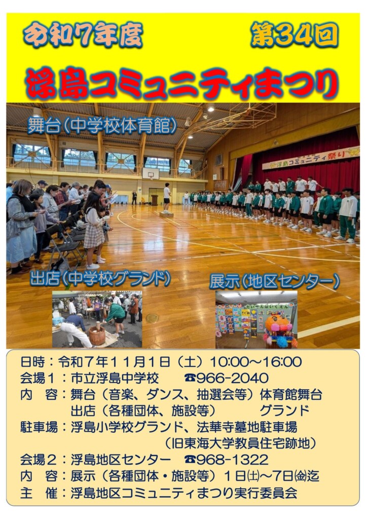 今年はステージイベントが浮島中学校体育館、出店が浮島中学校グランド、展示が浮島地区センター(〜11/7迄)にてそれぞれ行われます。