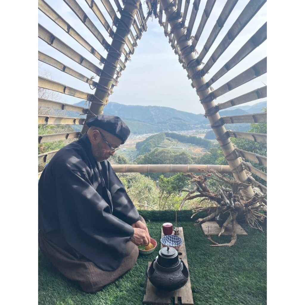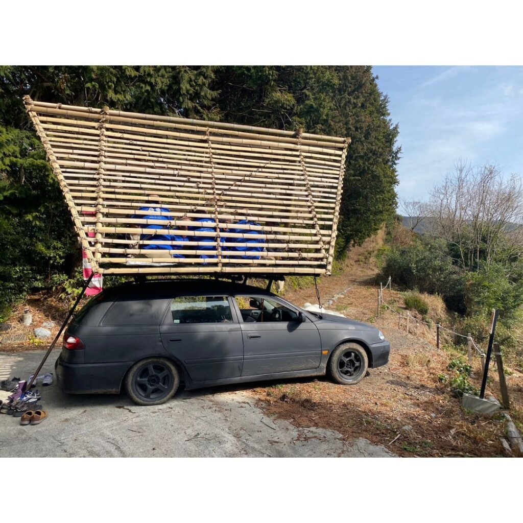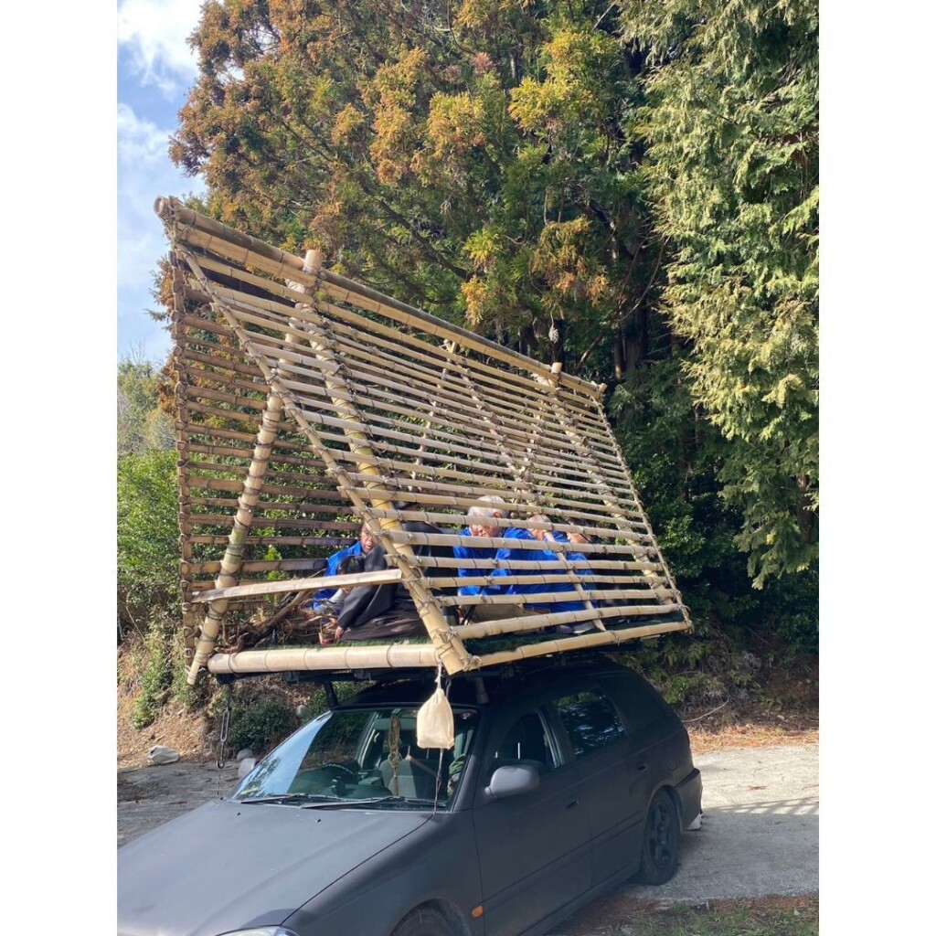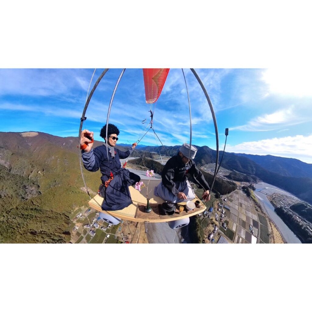 今期の芸術祭の中で「宮田歩(パラグライダー世界チャンピオン)×パラグライダー茶会」という前人未踏のパフォーマンスを見事に成功させた上野。さらには、自身の作品である「暴走花いけ号」(自動車)の茶室にて、川根町抜里の寺山(通称ぼいんぼいん山」でもお茶会を開催。